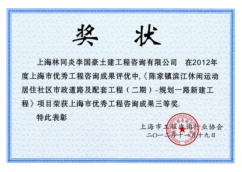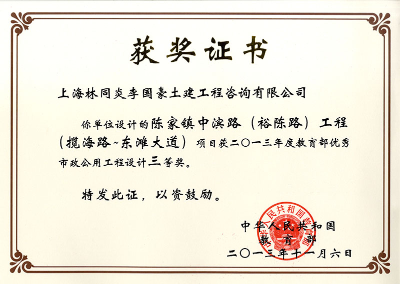 陳家鎮(zhèn)中濱路(裕陳路)工程(攬海路-東灘大道) 三等獎(jiǎng)